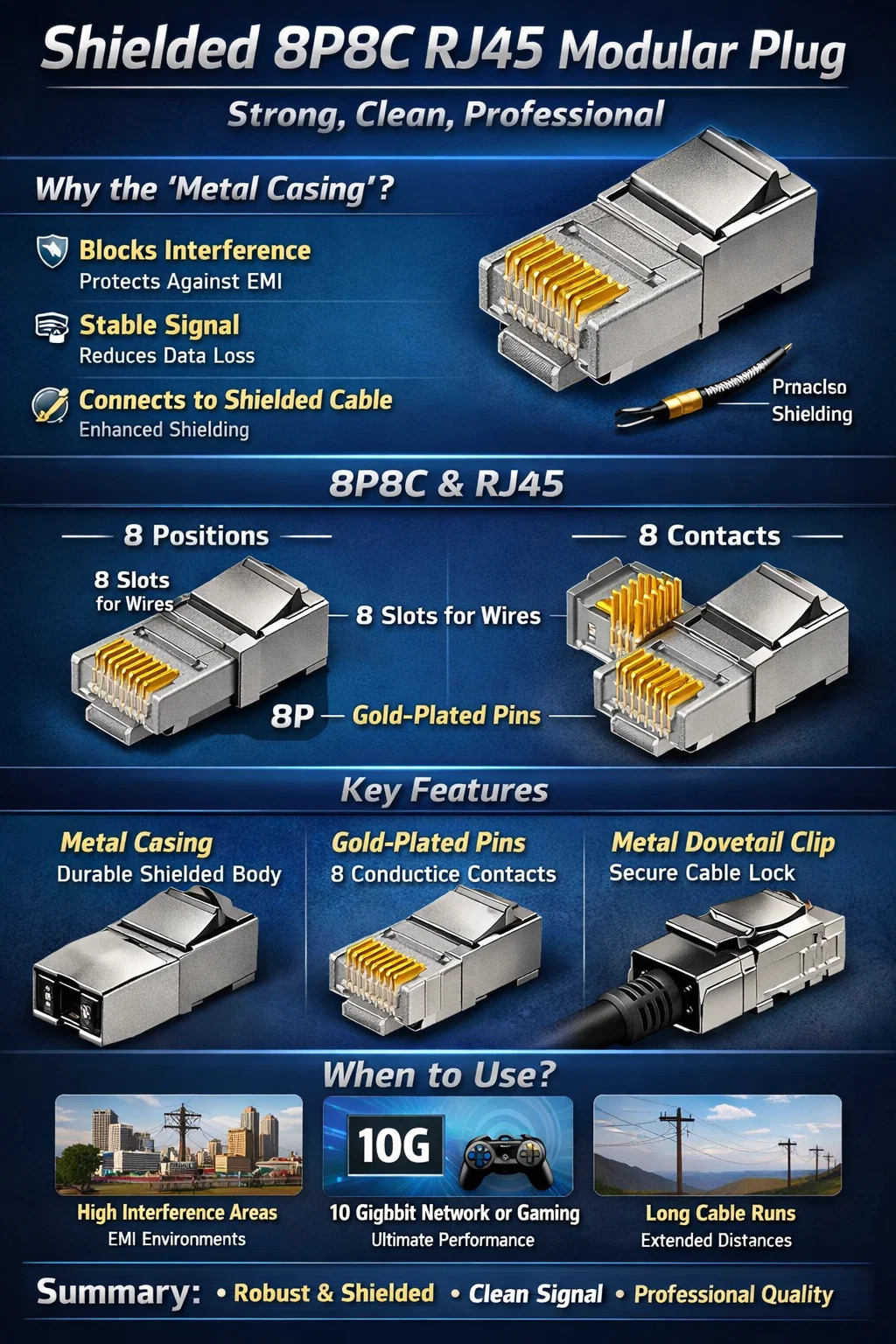 Blokiranje smetnji: "Shielded" u nazivu znači zaštita. Ovo metalno kućište djeluje poput pancirnog prsluka za konektor mrežnog kabela, posebno dizajnirano da blokira vanjske elektromagnetske smetnje (kao što su zalutali signali iz obližnjih žica ili buka velikih motora).