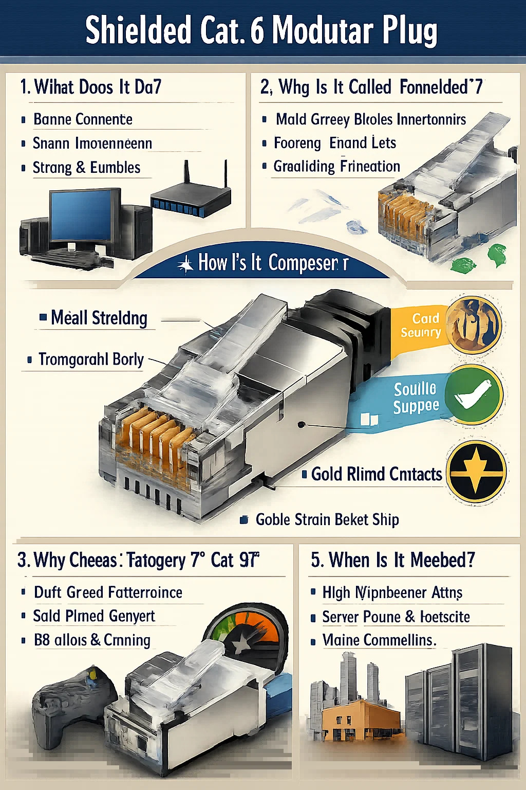 Ovo oklopljeni Cat.6 modularni utikač , jednostavno rečeno, je konektor mrežnog kabela sa "zaštitnim oklopom". Ako ste vidjeli konektore mrežnih kabela sa sjajnim metalnim kućištem, to je to.