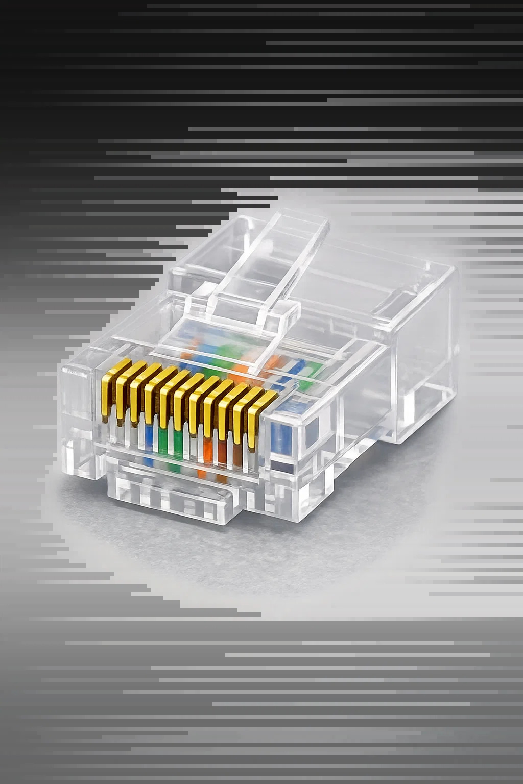 Ovo neoklopljeni 10P8C Cat.5e modularni utikač je malo "poseban" konektor mrežnog kabela. Iako izgleda vrlo slično mrežnim konektorima koje obično vidimo na računalima, ima zanimljiv mali detalj u svojoj konstrukciji.